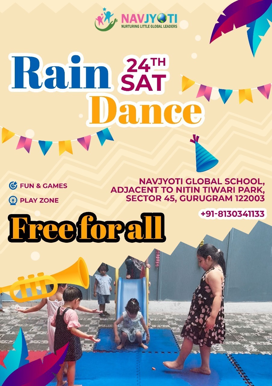 Navjyoti Global School invites children for a joyful and energetic day filled with rain dance, fun games, and play zone activities. Designed to offer a vibrant and engaging atmosphere, this event is perfect for kids to socialize, enjoy active play, and create cheerful memories. Open and free for all participants.