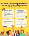 New Learning Horizons offers a comprehensive range of 30+ programs designed to support holistic development in children . With a focus on maximizing early brain development, the center provides structured learning across key areas such as phonics, storytelling, public speaking, academic tuitions, handwriting, foreign languages, music, dance, coding, and more. Each program is tailored to build logic, memory, focus, motor skills, creativity, and communication, giving children a strong foundation for academic and personal success.