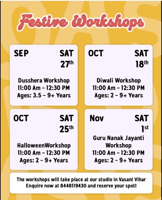 Join us for a series of special workshops throughout October, and November, where kids can immerse themselves in the joy of cultural festivals and holidays. From Dussehra to Diwali, Halloween, and Guru Nanak Jayanti, each session offers a unique opportunity for children to craft, paint, and explore their artistic talents.