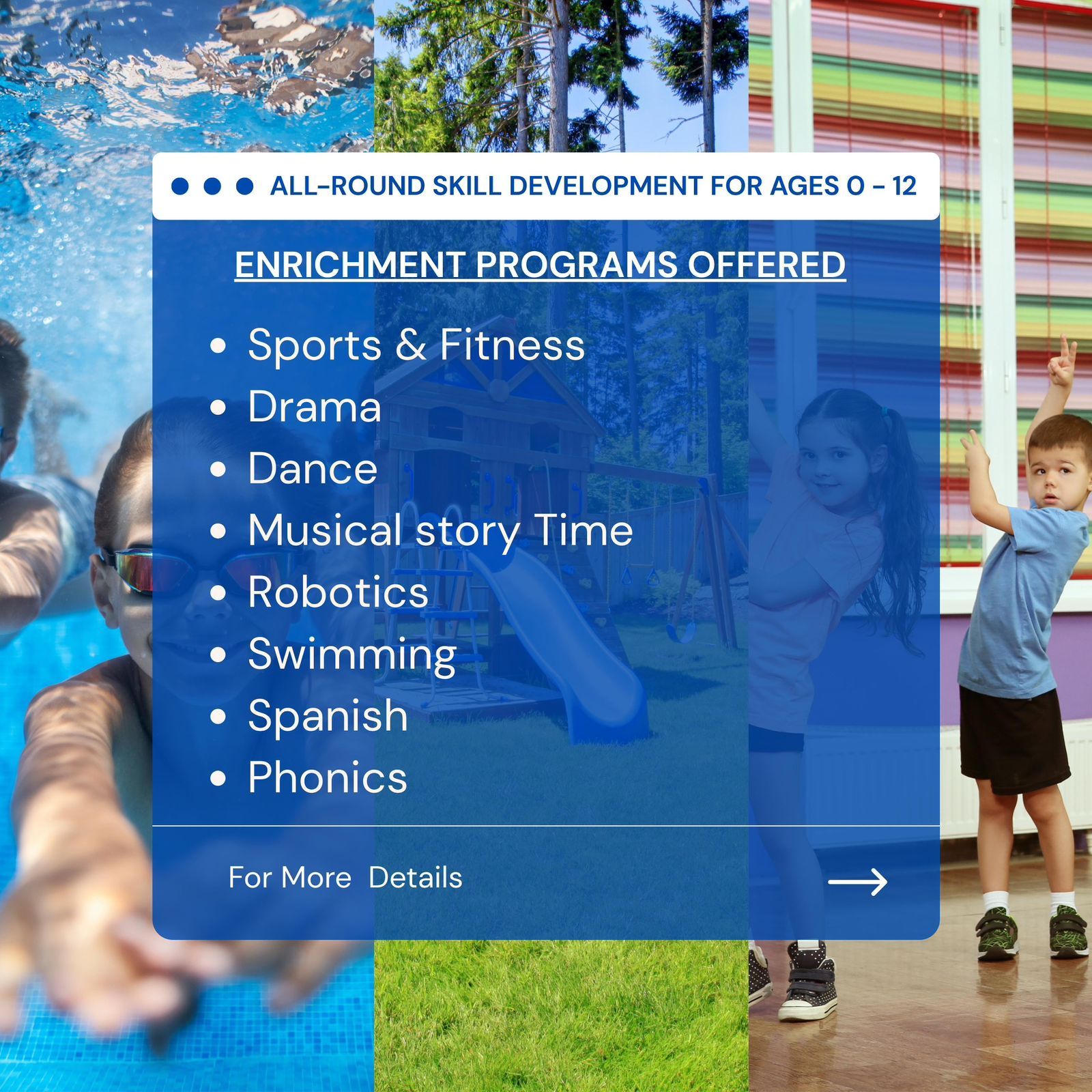 Highlight : Enrichment Program ,Sports & Fitness, Drama, Dance, Musical Story Time, Robotics, Swimming, Spanish, Phonics