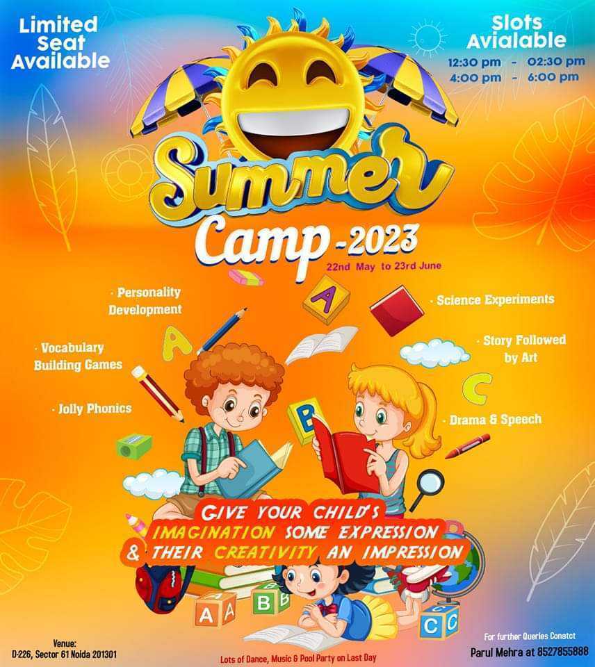 Summary: This summer camp, hosted by Parul Mehra, offers a variety of engaging activities such as science experiments đŹ, drama đ, and art sessions intertwined with storytelling đđ¨. Programs also focus on personality development đą and vocabulary games đ˛, ensuring a well-rounded experience for children.