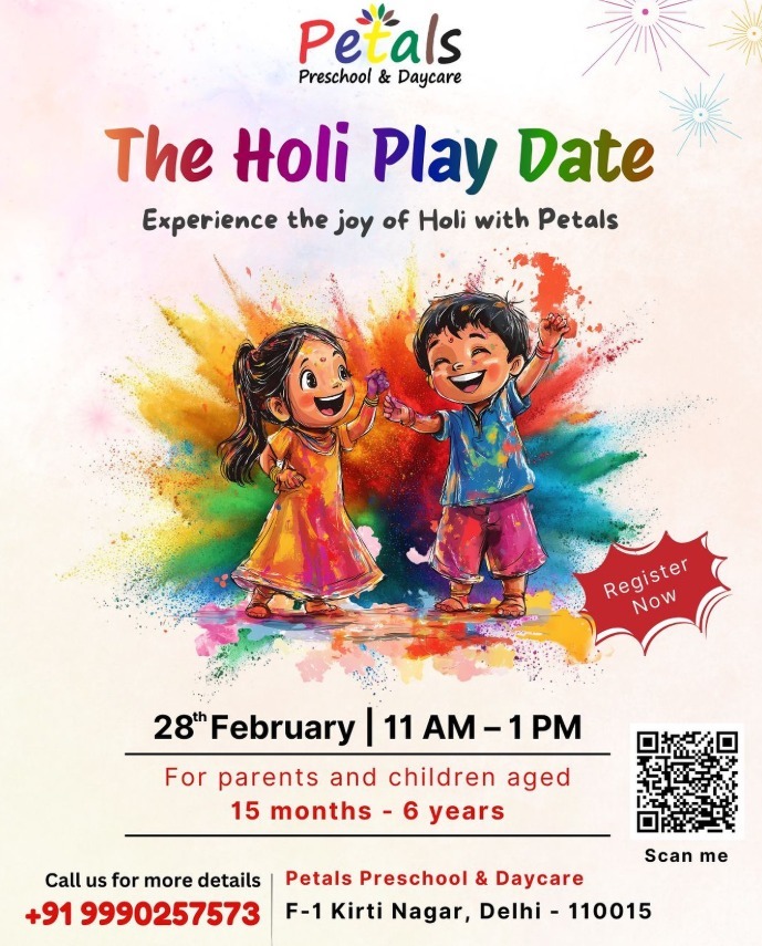 Join us at Petals Preschool & Daycare for "The Holi Play Date", a joyful celebration of colors and fun! Experience the vibrant spirit of Holi with your little ones! Specially crafted for children aged 15 months to 6 years and their parents.