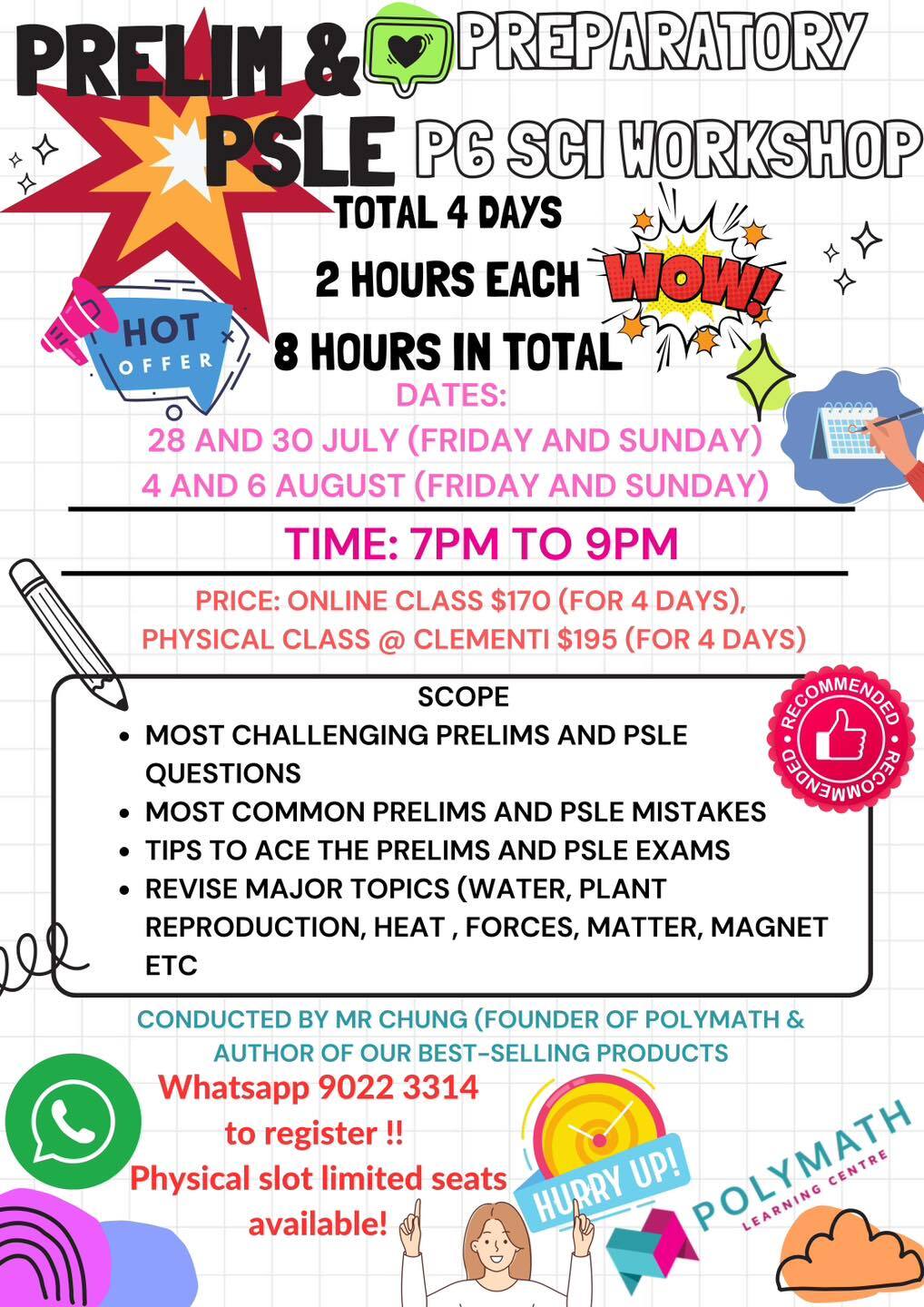 Polymath Learning Centre Hosted PRELIM & PREPARATORY PSLE P6 SCI WORKSHOP For Kids Enroll Your Child Highlights Scope- đ MOST CHALLENGING PRELIMS AND PSLE QUESTIONS đą MOST COMMON PRELIMS AND PSLE MISTAKES đ TIPS TO ACE THE PRELIMS AND PSLE EXAMS đ REVISE MAJOR TOPICS (WATER đ, PLANT đż, REPRODUCTION đź, HEAT đĄď¸, FORCES đ, MATTER âď¸, MAGNET đ§˛, ETC)