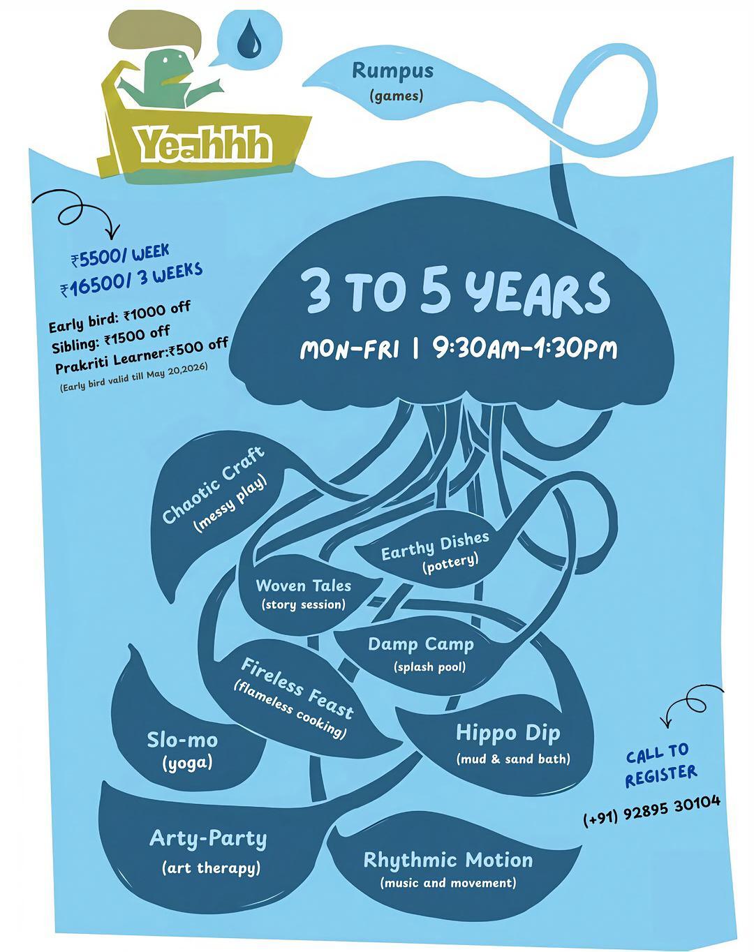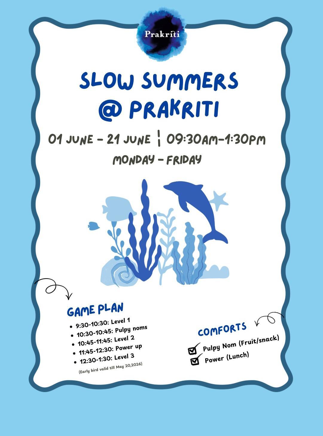 Slow Summers @ Prakriti is a thoughtfully designed camp where children learn through hands-on experiences, nature based activities, and mindful exploration. While you stay focused with our on-site coworking space, your little one stays joyfully engaged in a safe and nurturing environment.From pottery and storytelling to yoga, messy play, music, and splash fun every day is a blend of creativity, movement, and discovery.