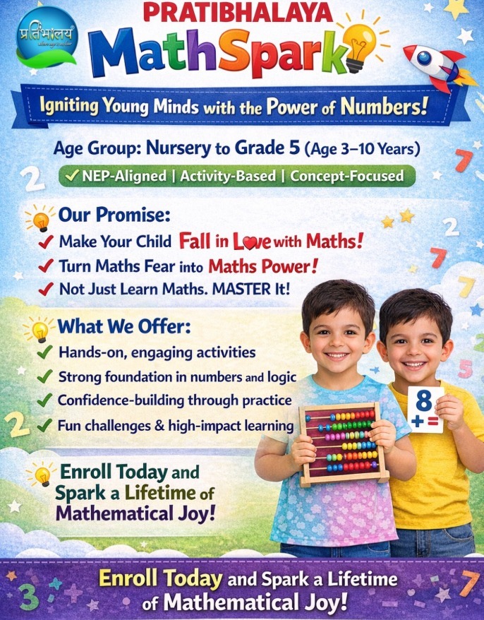 Pratibhalaya MathSpark is dedicated to igniting young minds with the power of numbers! Designed for children from Nursery to Grade 5 (ages 3-10 years), our program offers NEP-aligned, activity-based, and concept-focused learning experiences that make math both fun and meaningful.