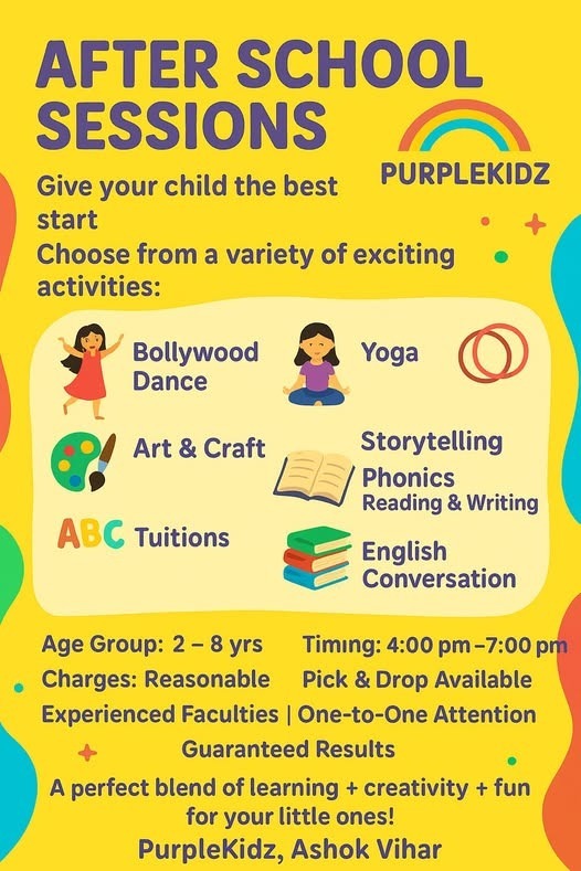 PurpleKidz After School Sessions offer a perfect mix of learning, creativity, and fun for children . With engaging activities like Bollywood dance, yoga, art & craft, storytelling, phonics, and academic support through reading, writing, and English conversation, every child gets individual attention from experienced faculty. The program not only boosts academic growth but also nurtures confidence, creativity, and communication skills. Pick & drop facility is also available for added convenience.