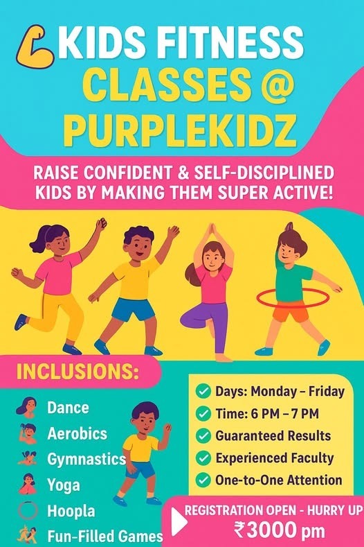 Kids Fitness Classes at PurpleKidz are designed to help children become more confident, self-disciplined, and super active. With a mix of dance, aerobics, gymnastics, yoga, hoopla, and interactive games, each session ensures all-round physical development in a fun and engaging way. Classes are led by an experienced faculty who provide one-to-one attention, ensuring every child enjoys learning while achieving guaranteed results in fitness and activity.