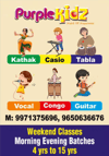 PurpleKidz presents weekend classes for kids designed for and above. The program includes sessions in Kathak, Vocal, Tabla, Casio, Congo, Guitar, Harmonium, and Piano. With flexible morning and evening batches, and receive one-to-one attention from experienced faculty. Classes cover singing in multiple languages (Hindi, Punjabi, English), classical and semi-classical techniques, as well as live performance and breathing techniques. These sessions offer structured learning in a creative and supportive environment.