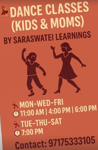 Saraswatei Learnings presents Dance Classes for kids and moms, conducted multiple times a week to suit different schedules. With sessions on Monday, Wednesday, and Friday , and additional evening classes on Tuesday, Thursday, and Saturday, the programme encourages movement, rhythm, and joyful expression in a fun and supportive environment.