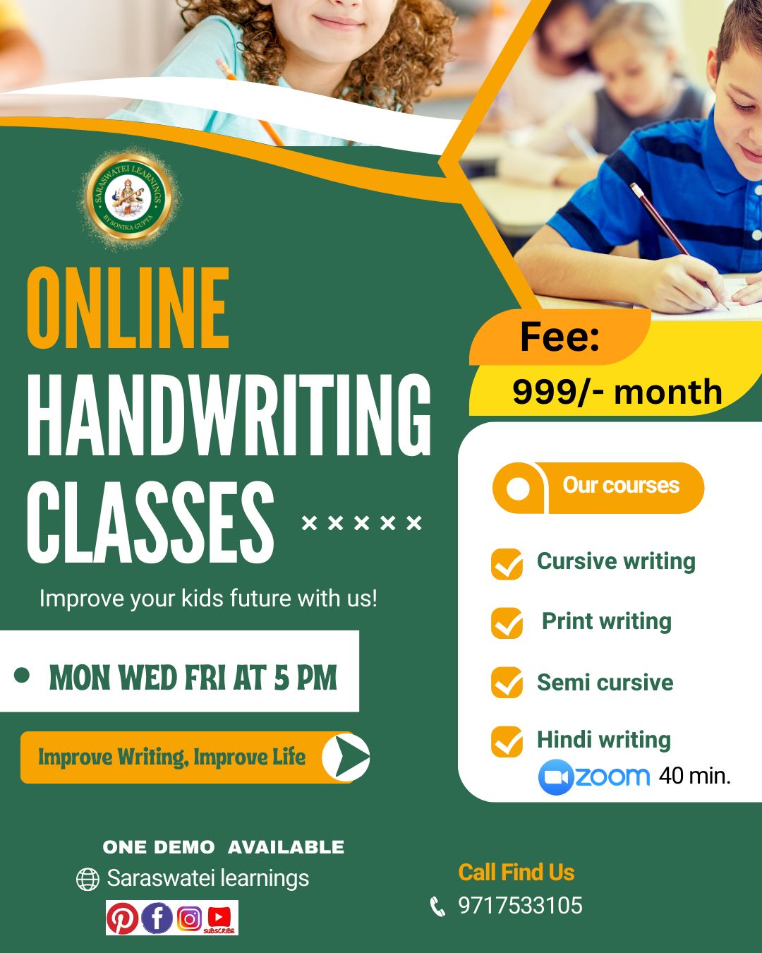 Join Saraswatei Learnings with professional teacher Sonika Gupen and help your child improve their handwriting skills. online classes focus on Cursive, Print, Semi-Cursive, and Hindi writing, designed to enhance focus, neatness, and confidence. A single trial session is available for new learners.