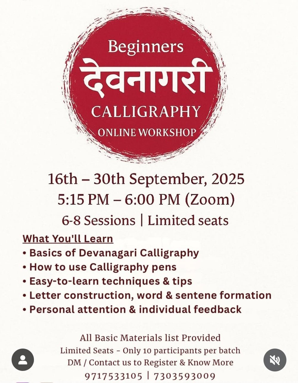 This online workshop introduces children to Devanagari calligraphy through 6–8 sessions. Participants will learn pen techniques, letter construction, and word formation with simple methods, personal guidance, and individual feedback. Limited to 10 participants per batch for focused learning.