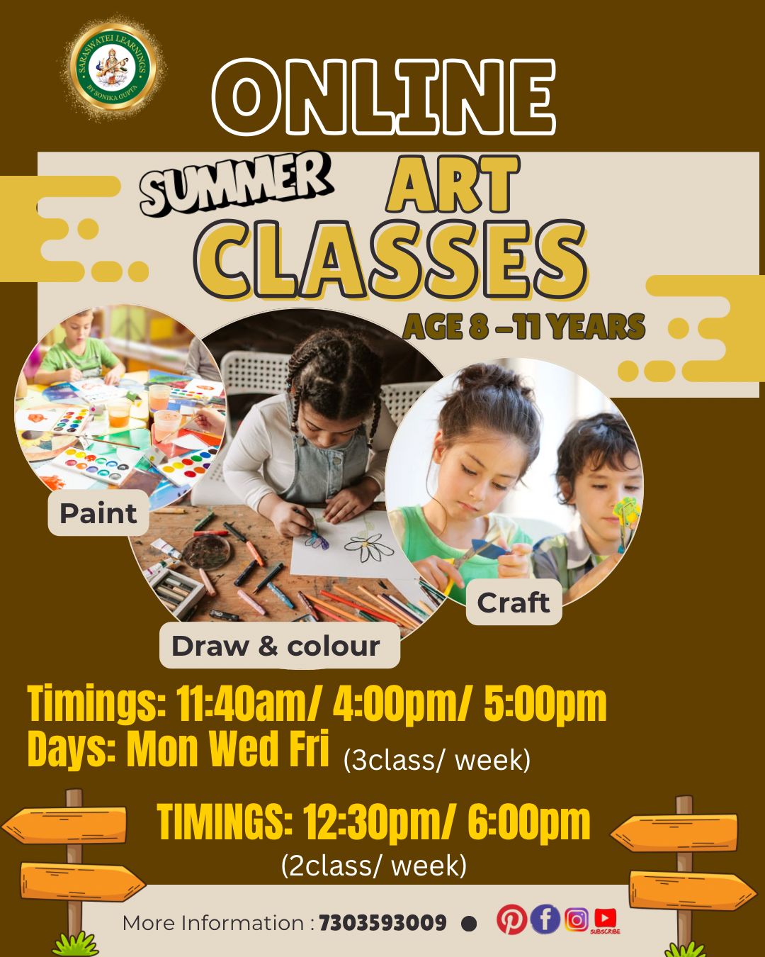 Let your child’s imagination come to life this summer! Join our fun and creative online art classes designed specifically for kids.From painting and crafting to drawing and coloring, these interactive sessions help children explore their artistic talents, build confidence, and have a blast — all from the comfort of home!