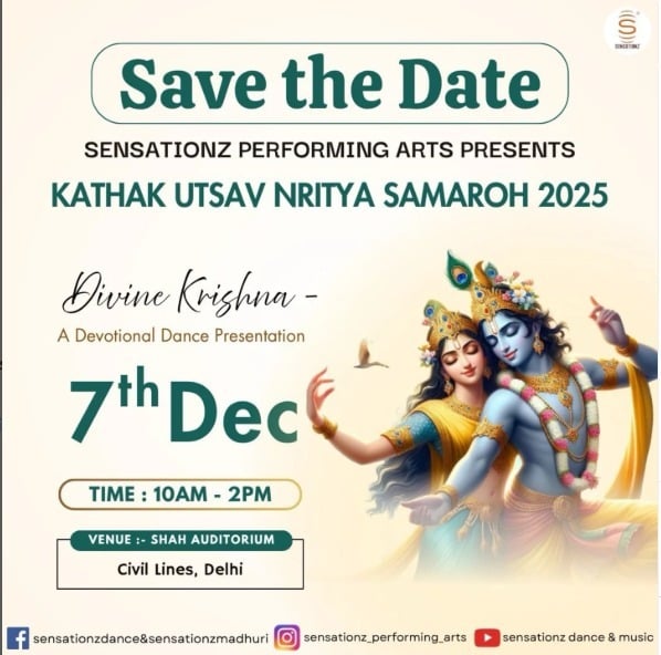 Save the date for an enchanting celebration of rhythm, devotion, and grace at Kathak Utsav Nritya Samaroh 2025, presented by Sensationz Performing Arts. Experience the divine artistry of classical dance with "Divine Krishna," a captivating devotional dance presentation that beautifully depicts the life and divine qualities of Lord Krishna through mesmerizing Kathak performances.