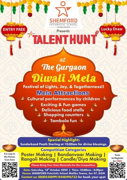 Join us for a vibrant celebration of Diwali with our Gurgaon Diwali Mela & Talent Hunt 2025! Enjoy a day filled with lights, joy, and togetherness.