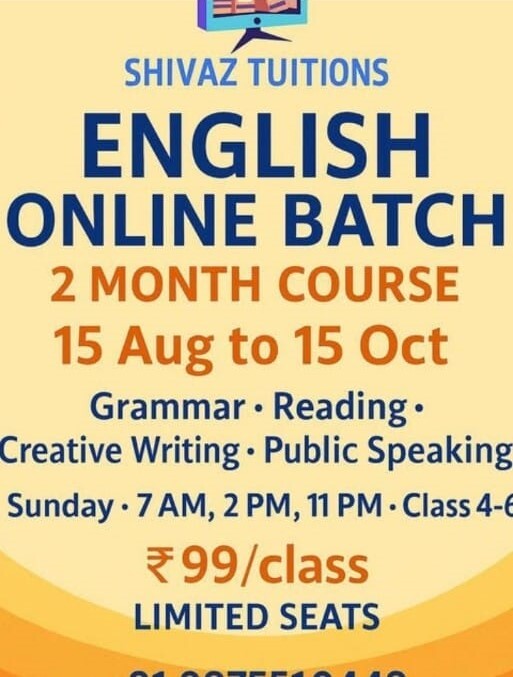 Enhance your English skills with Shivaz Tuitions’ Online English Batch. This 2-month course covers grammar, reading, creative writing, and public speaking, helping learners improve language fluency and confidence. Classes are interactive, engaging, and designed for effective learning.