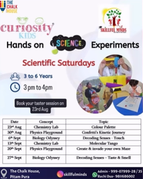 "Scientific Saturdays" is a fun and educational weekend program designed for kids. Hosted by Skillful Minds at The Chalk House, each session introduces young learners to basic scientific concepts through interactive, hands-on experiments. Covering themes from chemistry, physics, and biology, topics include colour mixing, kinetic movement, senses exploration, and more. It's a creative way to spark curiosity and build foundational scientific understanding in a joyful environment. Early bird offers available for the first 10 registrations.This is an independent program for kids — no parent accompaniment required. Pre-book your taster session and Paid trial classes are available. Transport facility can also be arranged for convenience.