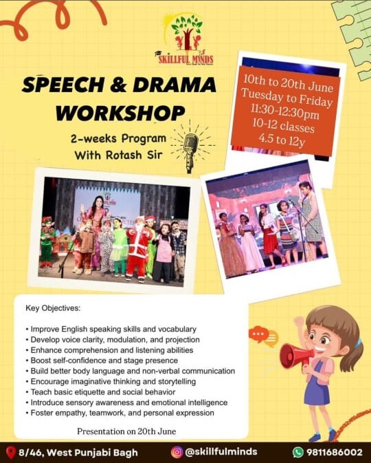 Skillful Minds presents a 2-week interactive Speech & Drama Workshop designed for kids. Guided by the experienced Rotash Sir, the program focuses on developing key communication and social skills through engaging activities. kids will enhance their vocabulary, voice clarity, and expression while building confidence and improving body language. The sessions encourage creativity, emotional awareness, and teamwork, preparing participants for a short presentation on the final day.