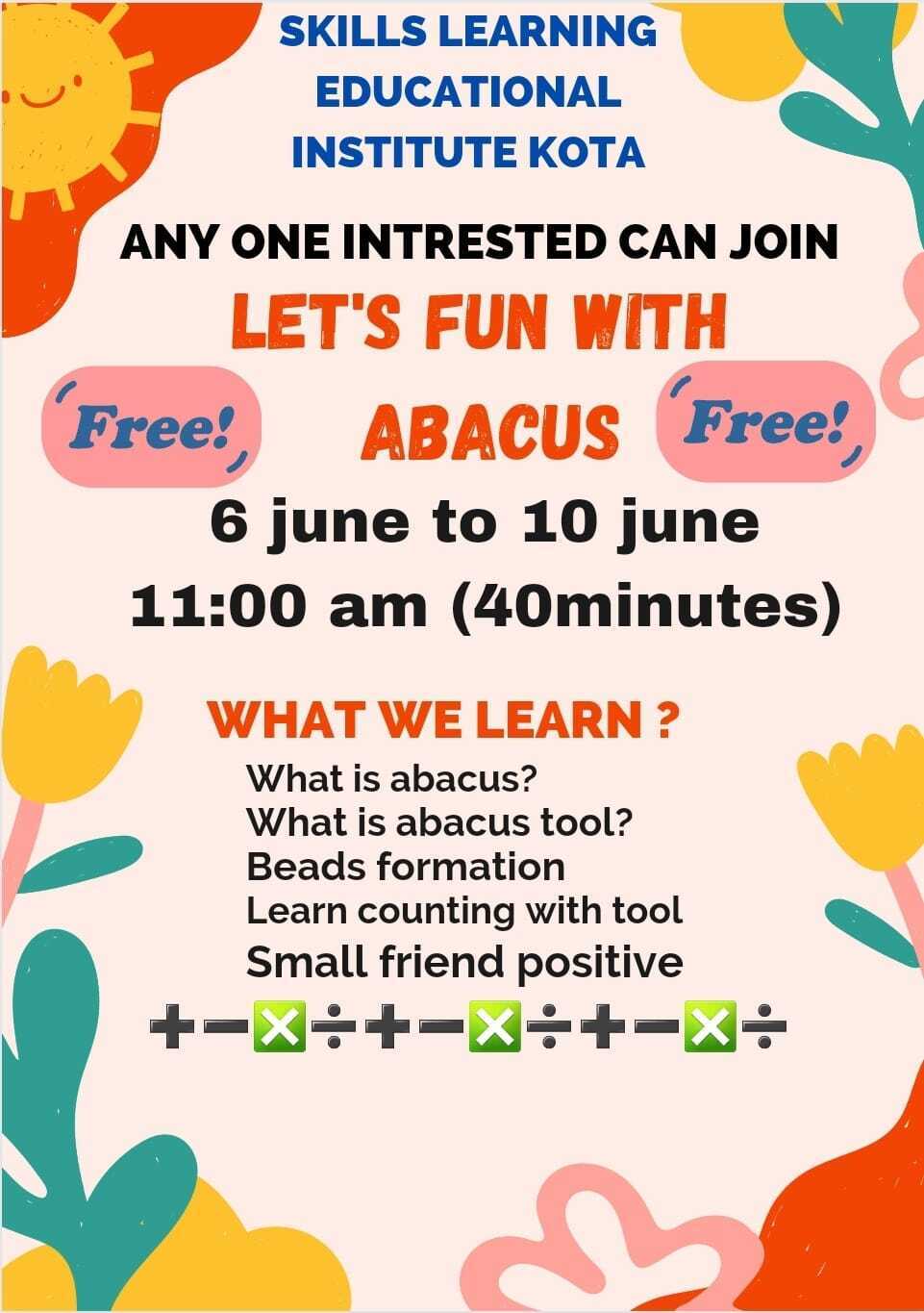 - đŤ Free Abacus classes at Skills Learning Educational Institute in Kota aim to enhance counting skills and create a positive learning atmosphere.