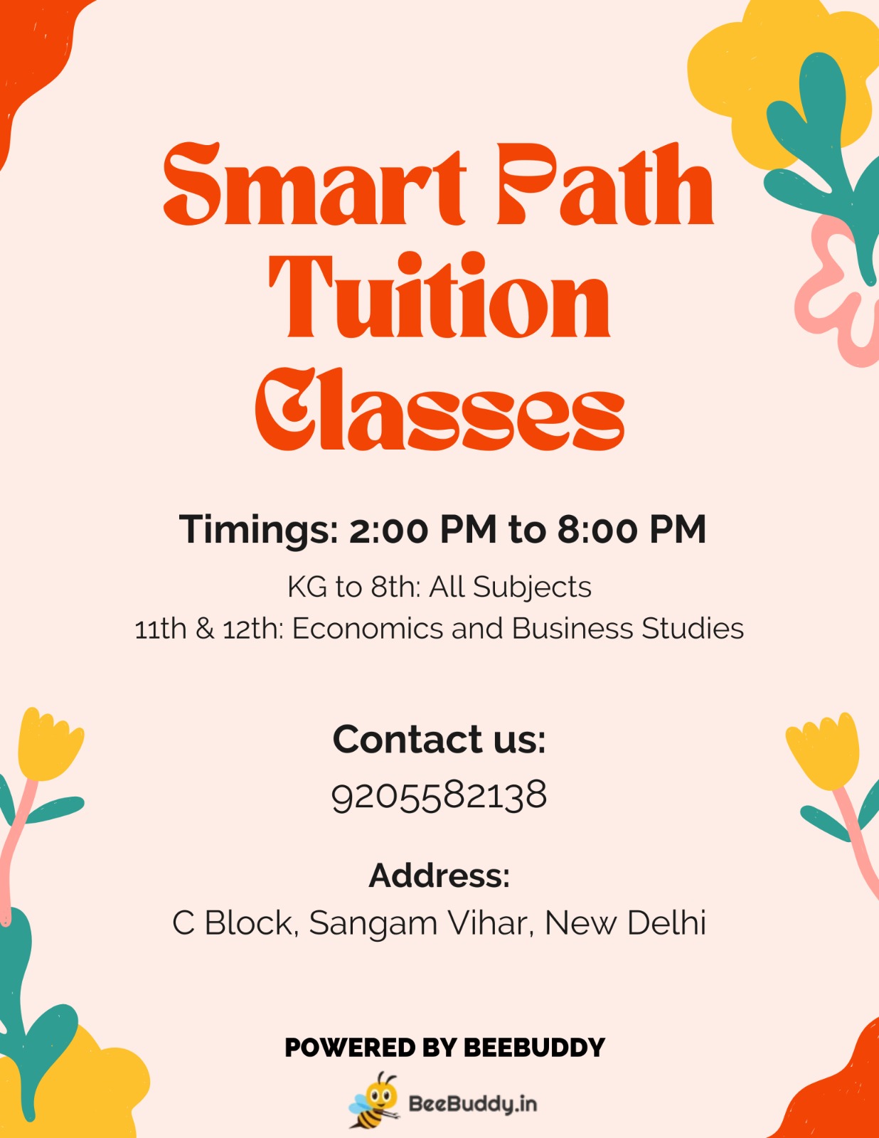 Smart Path Tuition Classes provides academic support from Kindergarten to Class 8 in all subjects, and for Class 11 & 12 with a focus on Economics and Business Studies. Designed to strengthen understanding, build confidence, and enhance performance, the sessions are structured to meet curriculum needs in a supportive learning environment. Ideal for students seeking quality tuition with flexible timings.