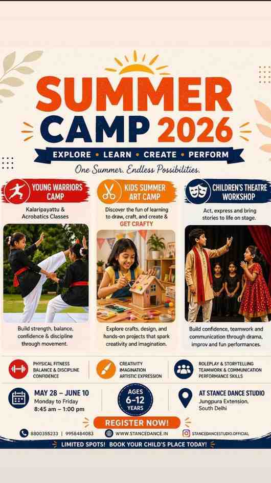 Designed for kids, this dynamic camp offers a perfect blend of fitness, arts, and performance. Children can explore Kalaripayattu & Acrobatics to build strength and discipline, dive into the Kids Art Camp to express creativity through drawing and crafts, and shine in the Children’s Theatre Workshop by acting, storytelling, and performing on stage.