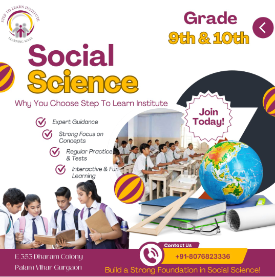 Step To Learn Institute offers specialized Social Science coaching for Class 9 and 10 . With a strong focus on conceptual clarity, regular practice, and interactive methods, this course helps students build a deep understanding of history, civics, geography, and economics. Guided by experienced faculty, students receive personal attention and consistent assessment to boost their academic performance. Enroll now to strengthen your foundation and make learning engaging and effective.