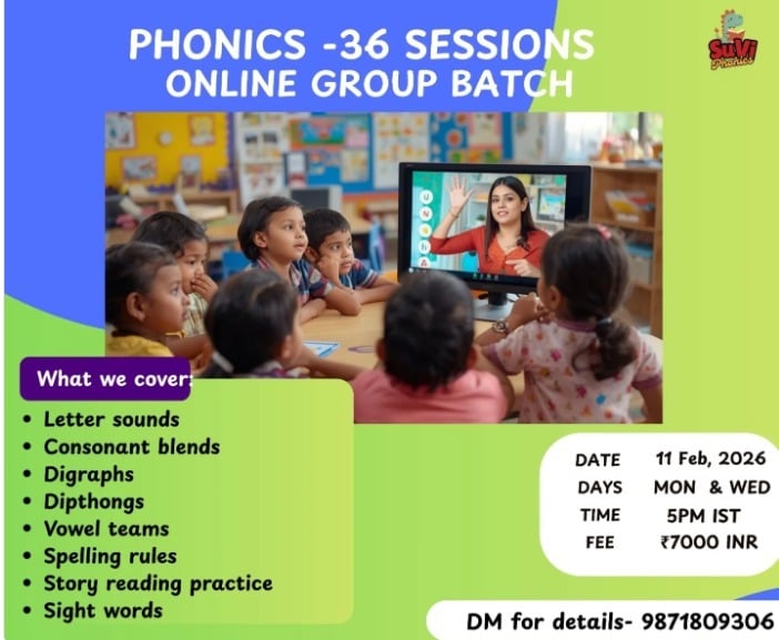 Join our Phonics 36 Sessions Online Group Batch with SuVi, designed to build a strong foundation in phonics and early reading skills. This comprehensive program covers essential topics such as letter sounds, consonant blends, digraphs, diphthongs, vowel teams, spelling rules, story reading practice, and sight words.
