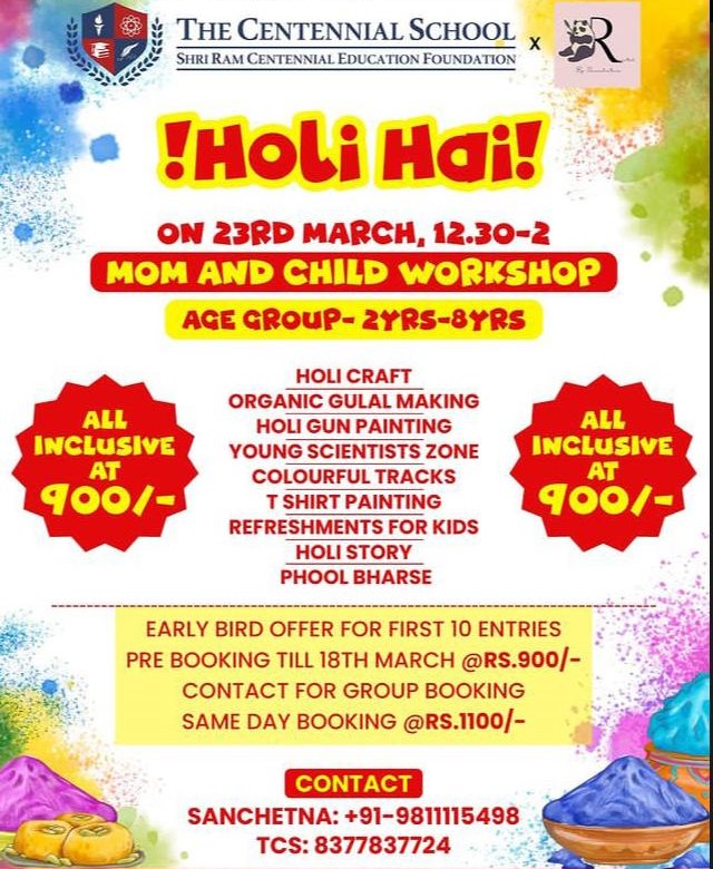 đ The Centennial School Hosted Holi Mom & Child Workshop đ§âđŚ For Kids đ Enroll Your Child Now đ đ Highlights đ đ¨ HOLI CRAFT đ đ ORGANIC GULAL MAKING đż đŤ HOLI GUN PAINTING đŤ đŠâđŹ YOUNG SCIENTISTS ZONE đŹ đ COLOURFUL TRACKS â đ T SHIRT PAINTING đ 𼤠REFRESHMENTS FOR KIDS đŞ đ HOLI STORY đ đ¸ PHOOL BHARSE đş đ EARLY BIRD OFFER FOR FIRST 10 ENTRIES đââď¸ đ PRE BOOKING TILL 18TH MARCH @RS.900/- đ đ CONTACT FOR GROUP BOOKING â đ SAME DAY BOOKING @RS.1100/- đŤ