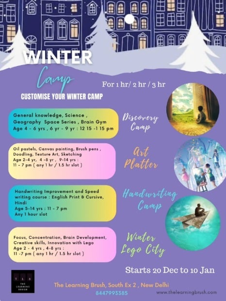 This winter, offers a variety of engaging and educational camps tailored for children of different age groups. Customize your winter camp with options including General Knowledge, Science, Geography, Space Series, and Brain Gym for ages 4-6, 6-9, and 12-15 years, available in 1, 2, or 3-hour slots. Explore your creativity with the Discovery Camp featuring Dil Pastels, Canvas Painting, Brush Pens, Doodling, Texture Art, and Sketching for ages 2-14 years, with flexible timing from 11 am to 7 pm. Improve handwriting skills with our Handwriting Improvement and Speed Writing Course in English and Hindi for ages 5-14, also available from 11 am to 7 pm. Enhance focus, concentration, brain development, and creative skills through Lego-based activities for ages 2-4, 4-8, and 9-14 years, in 1 or 1.5-hour slots. The Winter Lego City Camp runs from December 20 to January 10.