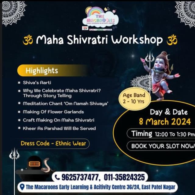 The Macaroons Early Learning & Activity Centre Hosted Maha Shivratri Workshop For Kids Enroll Your Child Now Highlights đ Shiva's Aarti đ Why We Celebrate Maha Shivratri? đ Through Story Telling đ§ Meditation Chant 'Om Namah Shivaya' đ¸ Making Of Flower Garlands đ¨ Craft Making On Maha Shivratri đ Kheer As Parshad Will Be Served đ Dress Code - Ethnic Wear