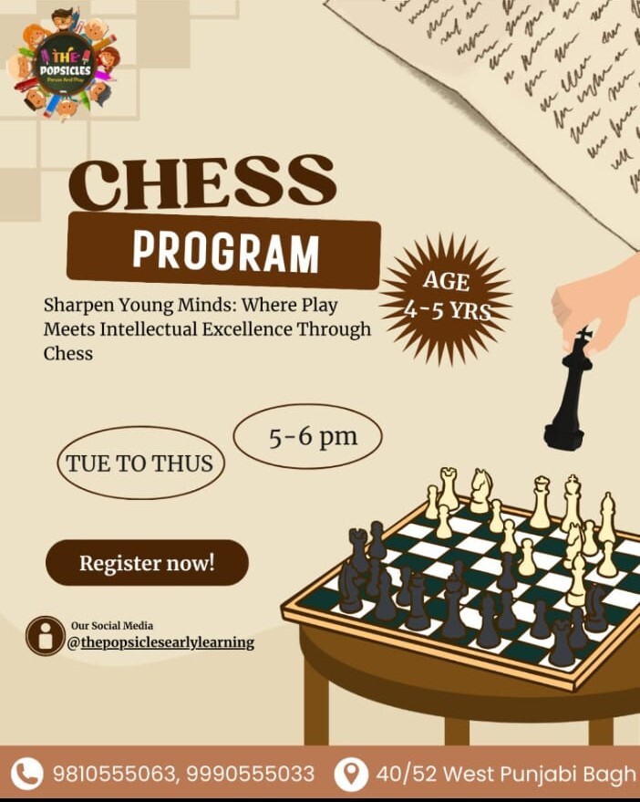 Sharpen your child’s mind with The Popsicles Chess Program – where play meets purpose. Designed especially for young learners aged 4 to 5 years, this program introduces the fundamentals of chess in a fun and engaging way. Children develop concentration, critical thinking, and problem-solving skills while enjoying the challenge of the game. A perfect blend of learning and play in a nurturing environment.