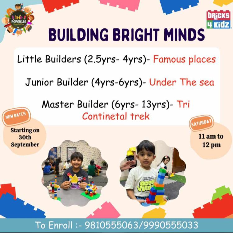 Summary: Join our Popsicles N Bricks 4 Kidz program to enhance your child's ability through fun and educational building activities! We have classes for children aged 2.5 to 13 years, covering different themes like famous places, ocean life, and a journey through multiple continents.