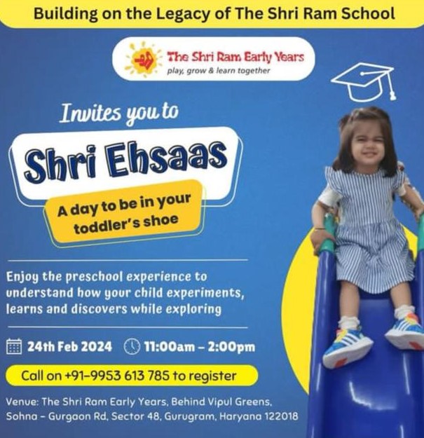 Summary: Shri Ehsaas is a unique event hosted by The Shri Ram Early Years, offering parents a chance to experience preschool from their toddlerâs perspective. Itâs a perfect opportunity to see how children learn and explore.