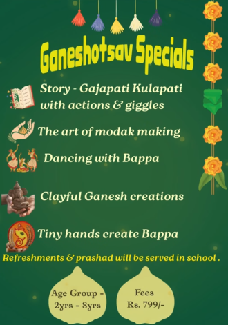 Celebrate the festive spirit of Ganesh Chaturthi with a special workshop designed for young children. In this engaging session, kids will enjoy engaging activities such as clay modeling to create their very own Ganpati idol, modak making, storytelling of Gajapati Kulapati with fun actions, and dancing with Bappa. The workshop blends creativity, culture, and devotion, giving children an opportunity to learn, explore, and celebrate in a joyful way. Refreshments and prashad will be served at school.