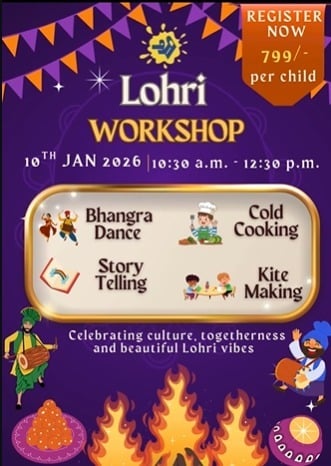 Join us for a lively Lohri Workshop! Designed for children to celebrate culture, togetherness, and the vibrant spirit of Lohri, this fun-filled session includes exciting activities such as Bhangra dance, cold cooking, storytelling, and kite making.