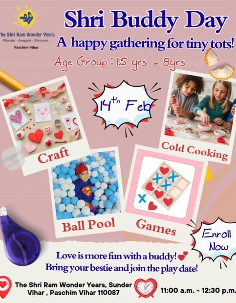 Join us for Shri Buddy Day at The Shri Ram Wonder Years! This joyful gathering is specially designed for tiny tots aged 1.5 to 8 years, offering a fun-filled morning of craft activities, cold cooking, ball pool, and exciting games.