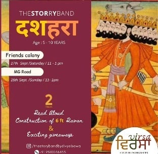 Celebrate the spirit of Dussehra with Virsa workshops by The Story Band. Young children will enjoy music, movement, storytelling, and playful activities, while older kids will engage in read-aloud sessions, creative storytelling, and the exciting construction of a 6 ft Ravan. Each workshop promises fun, learning, and festive giveaways to make the celebration even more memorable.