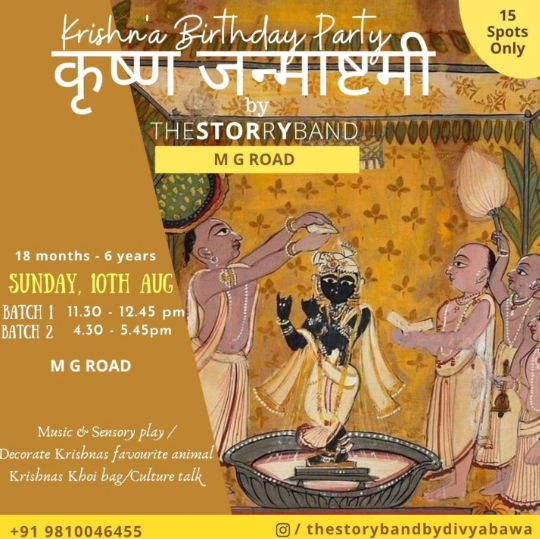 Celebrate Krishna Janmashtami in a joyful and meaningful way with The Storry Band by Divya Bawa. Specially curated for little ones ,This engaging celebration includes music, sensory play, a creative Krishna-themed craft session, and a mini culture talk. Children will get to decorate Krishna's favourite animal and take home a themed khoi bag. Limited to 15 spots per batch to ensure a warm, interactive experience.