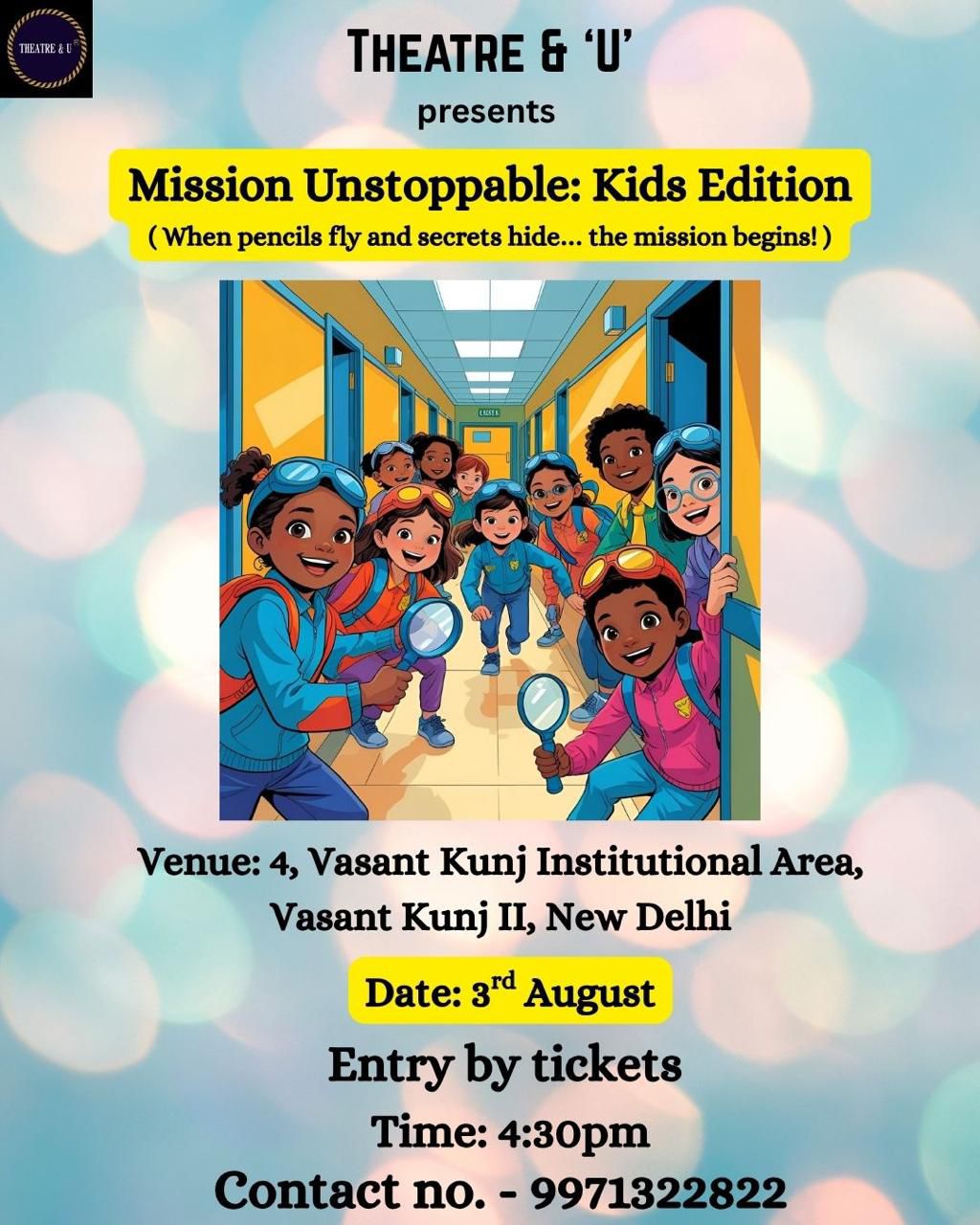 Theatre & U invites children and families to an exciting theatrical experience — Mission Unstoppable: Kids Edition. This action-packed children's play follows a thrilling journey where pencils fly, secrets unfold, and the mission truly begins. A perfect mix of mystery, humor, and adventure designed to spark imagination and creativity in young minds.