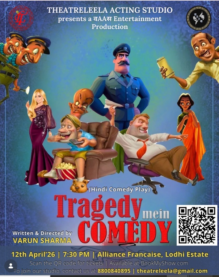 A lively Hindi comedy play presented by Theatreleela Acting Studio, Tragedy Mein Comedy brings together humor, drama, and entertaining characters in a fun theatrical experience. Written and directed by Varun Sharma, the production promises an engaging storyline filled withlaughter.