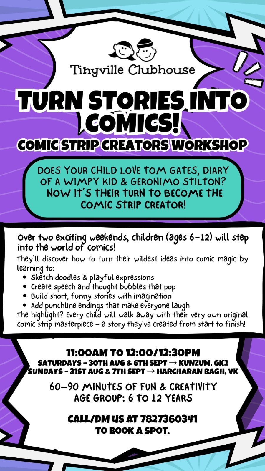 Tinyville Clubhouse presents the Comic Strip Creators Workshop for children who love books like Tom Gates, Diary of a Wimpy Kid, and Geronimo Stilton. Over two weekends, kids will step into the exciting world of comics. They will learn to sketch doodles, draw playful expressions, create speech and thought bubbles, build short funny stories, and add punchline endings. The highlight is that every child will proudly take home their very own original comic strip, created from start to finish. This workshop promises fun, imagination, and lots of creativity.