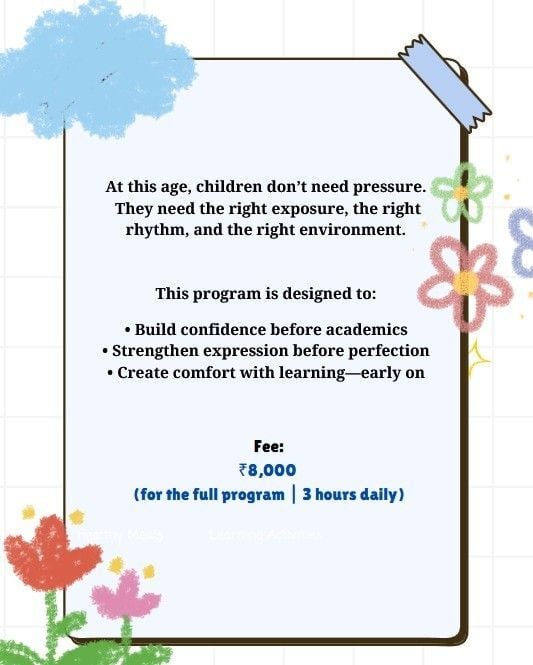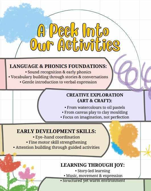 Designed especially for young learners, the program focuses on language and phonics foundations through sound recognition, vocabulary building, storytelling, and verbal expression, while also nurturing creativity through art, craft, watercolours, oil pastels, clay moulding, and hands-on activities. Children also develop essential early skills like eye-hand coordination, fine motor strength, attention building, and social comfort through guided play, music, movement, puzzles, and sensory experiences.