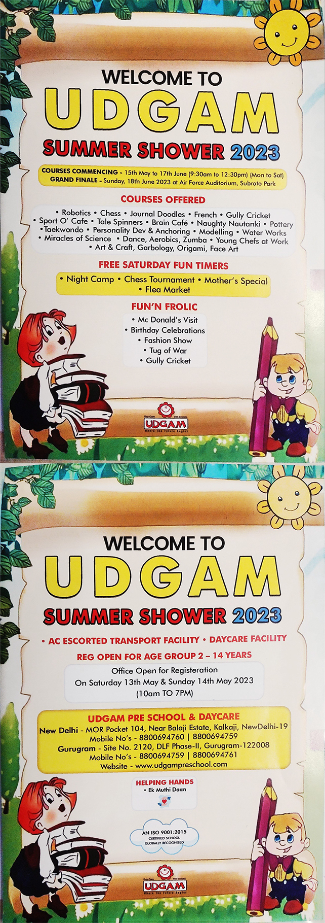 UDGAM Hosted Summer Shower for kids enroll your child Highlights: đ¤ Robotics âď¸ Chess đŤđˇ French đ Dance Aerobics đş Zumba đ Modelling đş Pottery đŠâđł Young chefs at work đ¨ Art & Craft đď¸ Garbology đ Origami đŠâđ¨ face art đŹ Miracles of science đ§ Water Works đ Personality Development & đ¤ Anchoring đ Naughty Nautanki đ§ Brain cafe đĽ Taekwondo đ Tale Spinners đ Sport o Cafe đ Gully Cricket đ Journal Doodle