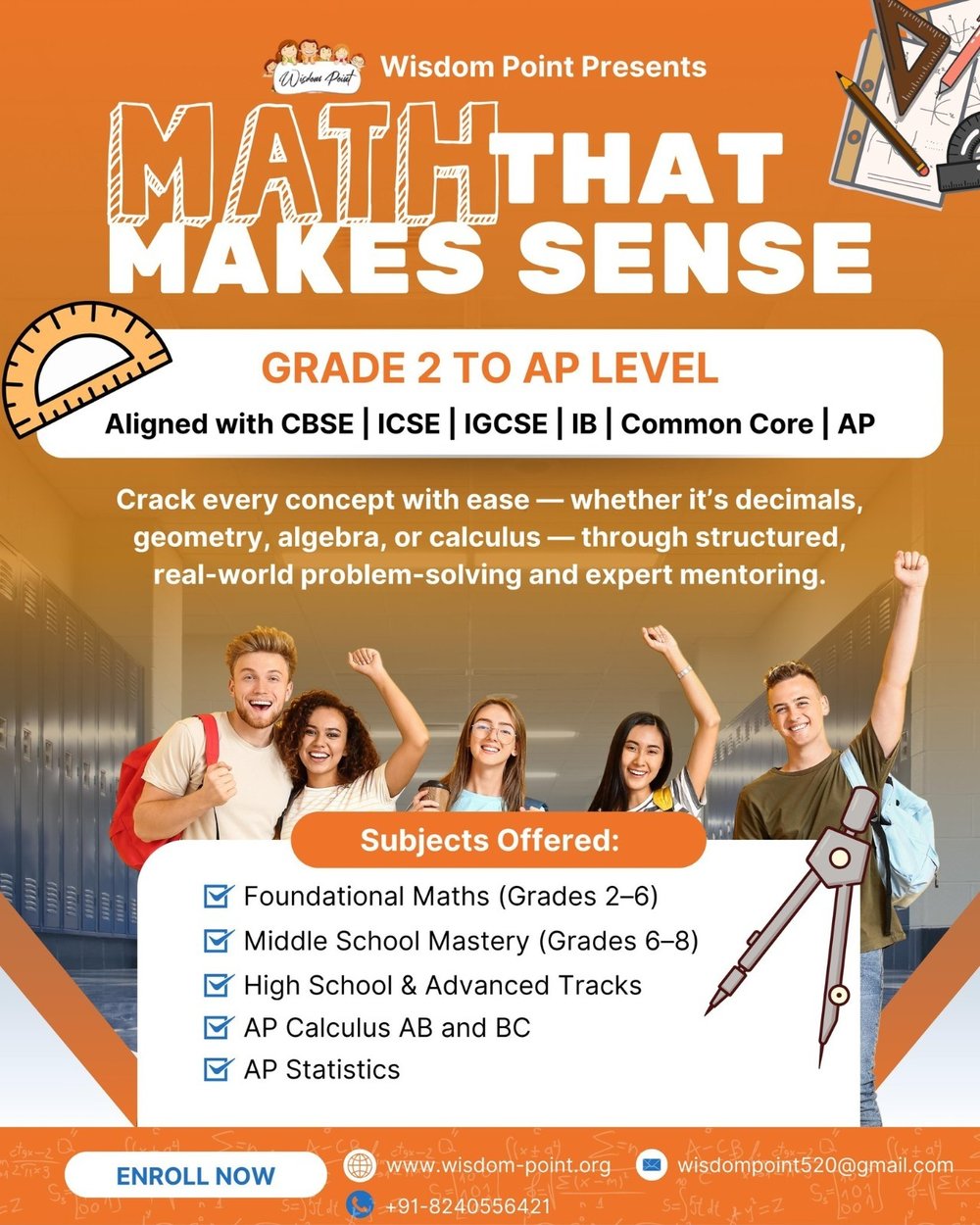 Wisdom Point offers structured, concept-driven math classes from Grade 2 up to AP level, aligned with CBSE, ICSE, IGCSE, IB, Common Core, and AP curriculum standards. Where they learn to master foundational to advanced topics including decimals, algebra, geometry, statistics, and calculus through real-world problem-solving and expert guidance. Programs include Foundational Maths (Grades 2–6), Middle School Mastery (Grades 6–8), High School Tracks, AP Calculus AB/BC, and AP Statistics.