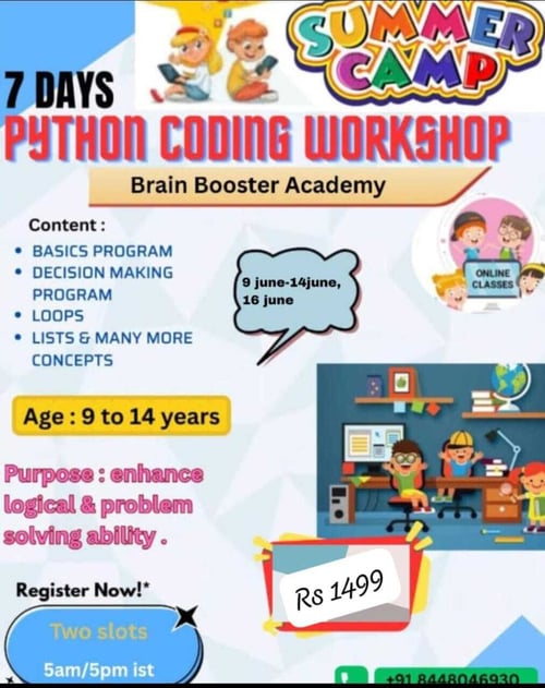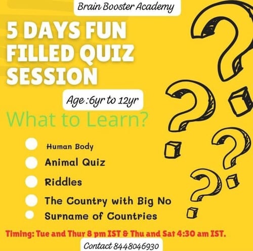 With a focus on Sports and Fitness, Workshops, Chess, Reading Writing, Drama Theatre, Creative Writing, Dance and Music, Summer Camp, STEM, Abacus, Extra-curriculars, Languages, Tuition Classes, Guitar, French, German, Sitar, Vocal, Handwriting, Spanish, Keyboard, Public Speaking, Vedic Maths, Graphic Design, Art and Craft, Drawing, Painting, Sketching, Calligraphy, Festive, Piano, Casio, English Speaking, Hindi, Tamil, Punjabi, Rubiks Cube, Mathematics, Science, Yoga, Coding, Python and a nurturing environment, Brain Booster Academy has become a go-to choice for parents in Online looking for meaningful, fun, and skill-building after-school options.